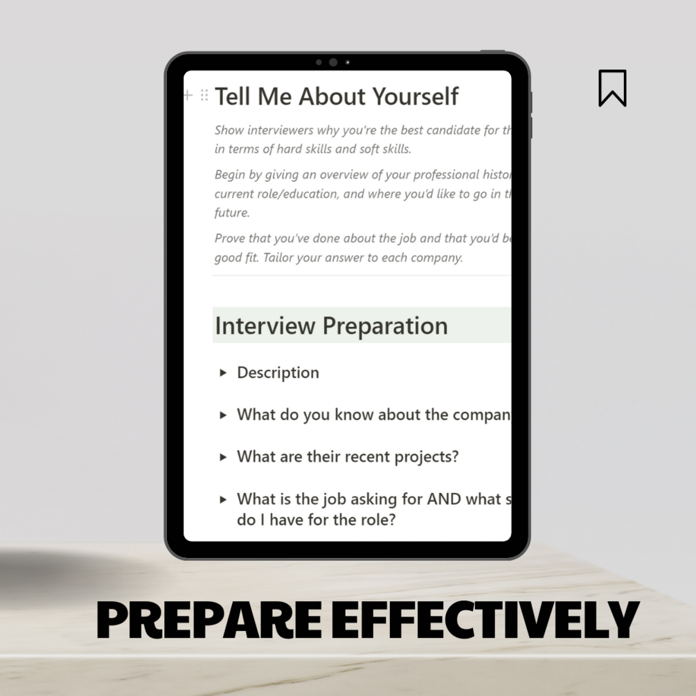 As someone who understands the nuances of job hunting and the importance of first impressions, I created this template to demystify the interview process. Drawing from personal experiences and the collective wisdom of successful professionals, this template is designed to offer a comprehensive, stress-reducing approach to interview preparation. Every feature, from the progress tracker to the customizable question bank, is crafted to enhance your preparation strategy, making your success inevitable.